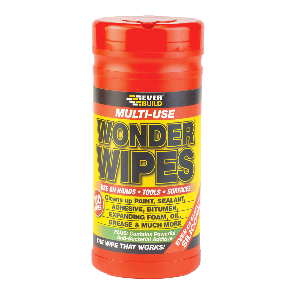 Τα Everbuild? Wonder Wipes είναι ειδικά σχεδιασμένα για να καθαρίζουν χέρια, εργαλεία και επιφάνειες από νωπή και ημι-ωριμασμένη μπογιά, στεγανωτικό, κόλλα, πίσσα, αφρό πολυουρεθάνης, λάδι, γράσο, ακόμη και σιλικόνη. Είναι ιδιαίτερα χρήσιμα όταν δεν υπάρχει διαθέσιμο νερό στο εργοτάξιο. Τα νέα μας Everbuild? Wonder Wipes Biodegradable (Βιοδιασπώμενα) είναι εξαιρετικά παχιά, δυνατά και 100% βιοδιασπώμενα- είναι σκληρά με τη βρωμιά και ειδικά σχεδιασμένα για τον επαγγελματία.