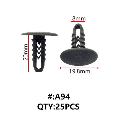 Το A94 είναι πλαστικό κλιπς συγκράτησης τύπου ?δέντρου? (Tree Type), σχεδιασμένο για ασφαλή στερέωση πλαστικών και μεταλλικών πάνελ στο αμάξωμα του οχήματος.