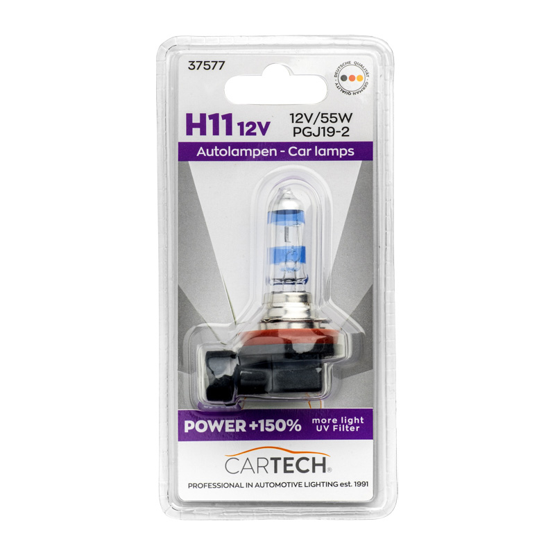 Η λάμπα H11 – 12V/55W – PGJ19-2 SUPER WHITE +150% MORE LIGHT είναι ένας τύπος λαμπτήρα αλογόνου που προσφέρει έως και 150% περισσότερη φωτεινότητα σε σχέση με τις τυπικές λάμπες H11. Λειτουργεί σε τάση 12V με ισχύ 55W και διαθέτει βάση PGJ19-2. Η τεχνολογία SUPER WHITE παρέχει λευκό και πιο έντονο φως, βελτιώνοντας σημαντικά την ορατότητα και την ασφάλεια κατά την οδήγηση σε συνθήκες χαμηλού φωτισμού, επιτρέποντας καλύτερη αντίληψη του δρόμου και των εμποδίων.