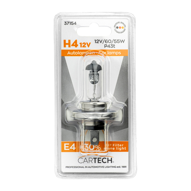 Η λάμπα H4 – 12V/60/55W – P43t +30% MORE LIGHT είναι ένας τύπος λαμπτήρα αλογόνου που χρησιμοποιείται κυρίως σε φώτα αυτοκινήτου για φώτα πορείας και διασταύρωσης. Λειτουργεί σε τάση 12V με ισχύ 60W για φώτα μεγάλου σκαλοπατιού και 55W για φώτα μικρού σκαλοπατιού. Διαθέτει βάση P43t και το χαρακτηριστικό “+30% MORE LIGHT” προσφέρει έως και 30% περισσότερη φωτεινότητα σε σχέση με τις τυπικές λάμπες H4, βελτιώνοντας την ορατότητα και την ασφάλεια κατά την οδήγηση σε συνθήκες χαμηλού φωτισμού.