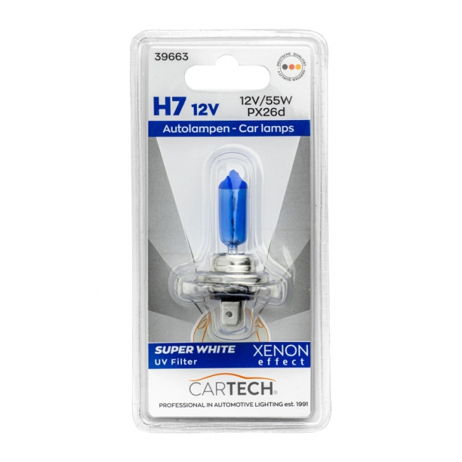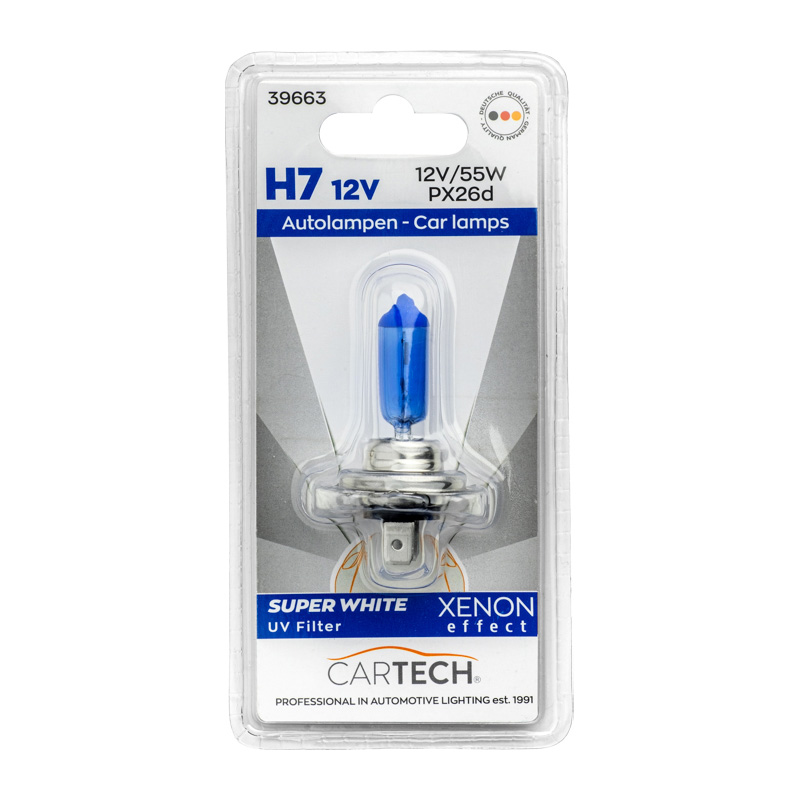 Η λάμπα H7 – 12V/55W – PX26d SUPER WHITE προσφέρει καθαρό λευκό φως, βελτιώνοντας την ορατότητα και την ασφάλεια κατά την οδήγηση. Η τεχνολογία SUPER WHITE εξασφαλίζει έντονο και φωτεινό φως, που διευκολύνει την αντίληψη των οδικών συνθηκών, ιδιαίτερα κατά τη διάρκεια της νύχτας ή σε δύσκολες καιρικές συνθήκες. Ιδανική για φώτα αυτοκινήτου, προσφέρει καλύτερη ποιότητα φωτισμού και μειώνει την καταπόνηση των ματιών.