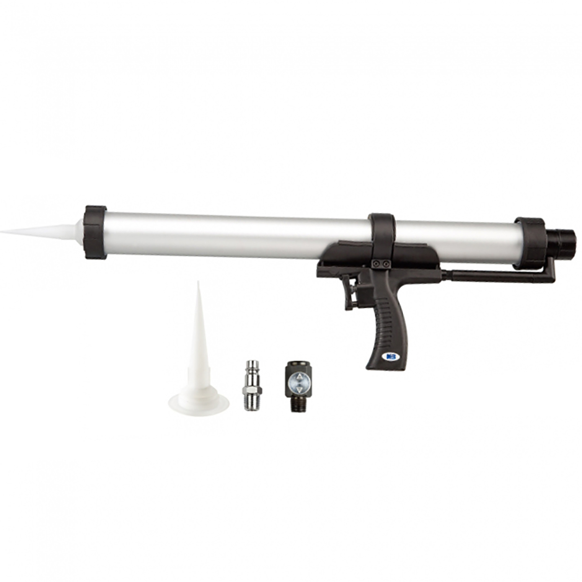 Πιστόλι αέρος ικανά για όλους τους τύπους συγκολλητικών υλικών (φύσιγγες και σαλάμια). Περιλαμβάνει ρυθμιστή αέρα x1, ταχυσύνδεσμο x1,Αντάπτορας μύτη x1. ? Πίεση: 6 bar ? Κατανάλωση αέρα: 40 L/min ? Ώθηση: 90 kgf ? Θόρυβος 80 dBA ? Καθαρό βάρος: 1,21 kg ? Μήκος: 62 cm