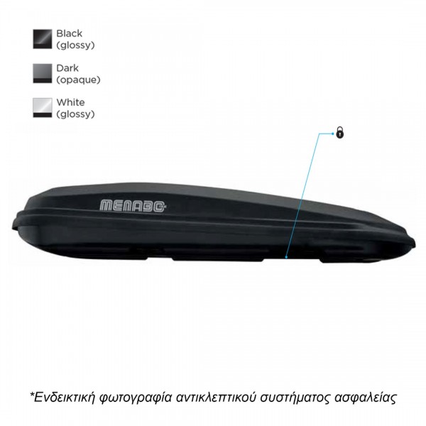 Μπαγκαζιέρα οροφής της σειράς DIAMOND, η οποία αποτελεί τη καλύτερη στη κατηγορία της σε ό,τι αφορά την ασφάλεια μεταφοράς φορτίου, καθώς και την υψηλή ποιότητα υλικών από την εταιρία MENABO, 100% ιταλικής προέλευσης και κατασκευής από πλαστικό σε μαύρο χρώμα με γυαλιστερή υφή και χωρητικότητα φορτίου 450 lt, ιδανική για τη δημιουργία επιπρόσθετου αποθηκευτικού χώρου κατά τη διάρκεια ταξιδιού ή και για μεταφορές εντός πόλης.