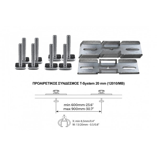 3)T-system 20 mm: Kit σύνδεσμων τοποθέτησης σε μορφή Τ, το οποίο σταθεροποιείται με την χρήση πεταλούδων εσωτερικά της μπαγκαζιέρας και εισχωρεί συρταρωτά επάνω στην μπάρα οροφής, αφαιρώντας τις πλαστικές τάπες στα πλάγια των άκρων της. Συμβατό με μπάρες που διαθέτουν εγκοπή (σιρίτι) σε σχήμα Τ στο άνω μέρος τους, διαστάσεις Τ υποδοχής από 13 έως 20 mm το άνω πιο φαρδύ μέρος της βίδας (W) και min 8,5 mm ο λαιμός της βίδας (X), καθώς και απόσταση τοποθέτησης μεταξύ των μπαρών από 600 mm έως 900 mm - το kit 12010/MB δεν περιλαμβάνεται στη συσκευασία, πωλείται ξεχωριστά.