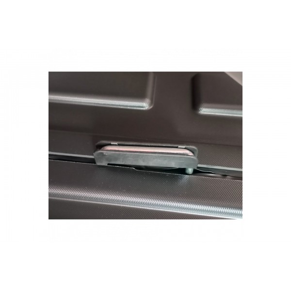 Μπαγκαζιέρα οροφής αυτοκινήτου, ιταλικής προέλευσης, με μαύρη ματ ανάγλυφη υφή, η οποία  είναι κατασκευασμένη από πλαστικό ανακυκλώσιμο υλικό προστατευμένο από τις UV υπεριώδης ακτινοβολίες, ανθεκτικό σε υψηλές και χαμηλές θερμοκρασίες. Διαθέτει κεντρικό σύστημα κλειδώματος ασφαλείας, σύστημα ανοίγματος με πλαστικά ψαλίδια, πρόσθετη κουμπωτή ασφάλεια στο μπροστινό μέρος και ειδικές εσοχές για τη καλύτερη εφαρμογή επάνω στις μπάρες.