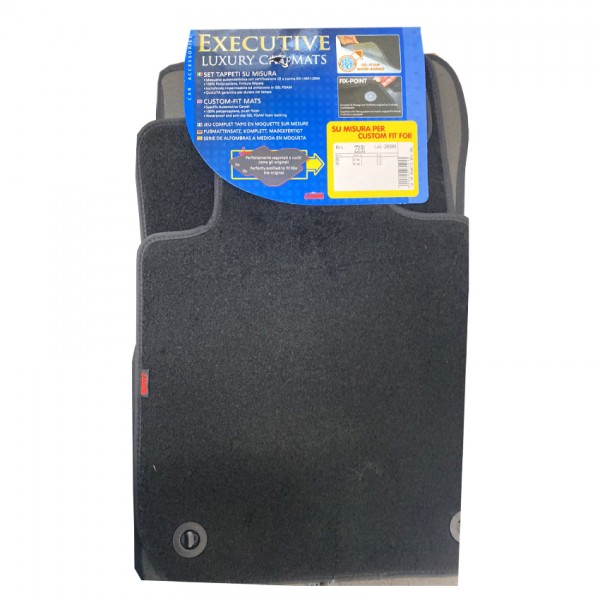 Πατάκια αυτοκινήτου από την εταιρία LAMPA, ιταλικής προέλευσης, κατασκευασμένα από υψηλής ποιότητας μοκέτα - 100% πολυπροπυλένιο - σε μαύρο χρώμα με περιμετρικό φινίρισμα από βελούρ ρέλι (απομίμηση βελούδου), σχεδιασμένα για να ταιριάζουν ακριβώς στις διαστάσεις του δαπέδου του εκάστοτε οχήματος - Συμβατά προϊόν. Είναι αδιάβροχα και διαθέτουν αντιολισθητικό πάτο ενισχυμένο με gel στο πίσω μέρος τους για καλύτερη πρόσφυση στο δάπεδο, καθώς και κουμπιά στερέωσης fix-points για όσα οχήματα είναι εξοπλισμένα με αντίστοιχες εργοστασιακές υποδοχές για να παραμένουν σταθερά στο πάτωμα της καμπίνας κατά την είσοδο/έξοδο των επιβατών.