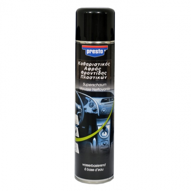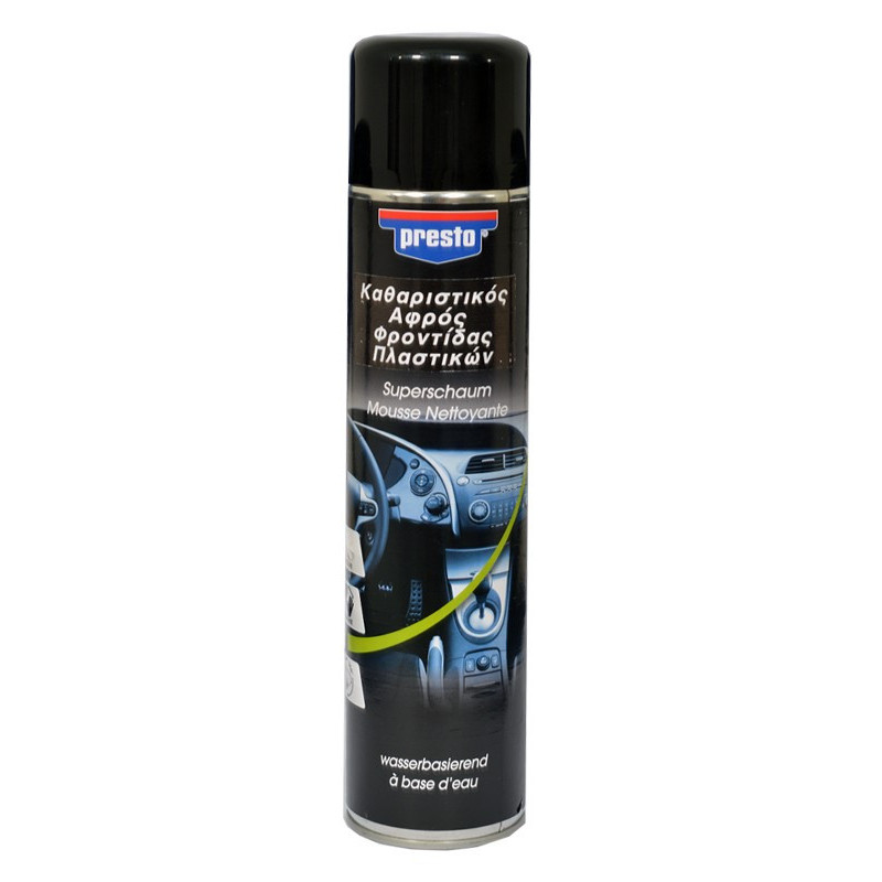 Το Presto Cockpit-Spray σε αφρό  απωθεί τη σκόνη από τις επιφάνειες και συντηρεί τα πλαστικά με σιλικόνη. Ειδικά για τον καθαρισμό είναι εξαιρετικό, καθώς το σπρέι super αφρού με βάση το νερό, δεν αφήνει λεκέδες ακόμα και στα παράθυρα.