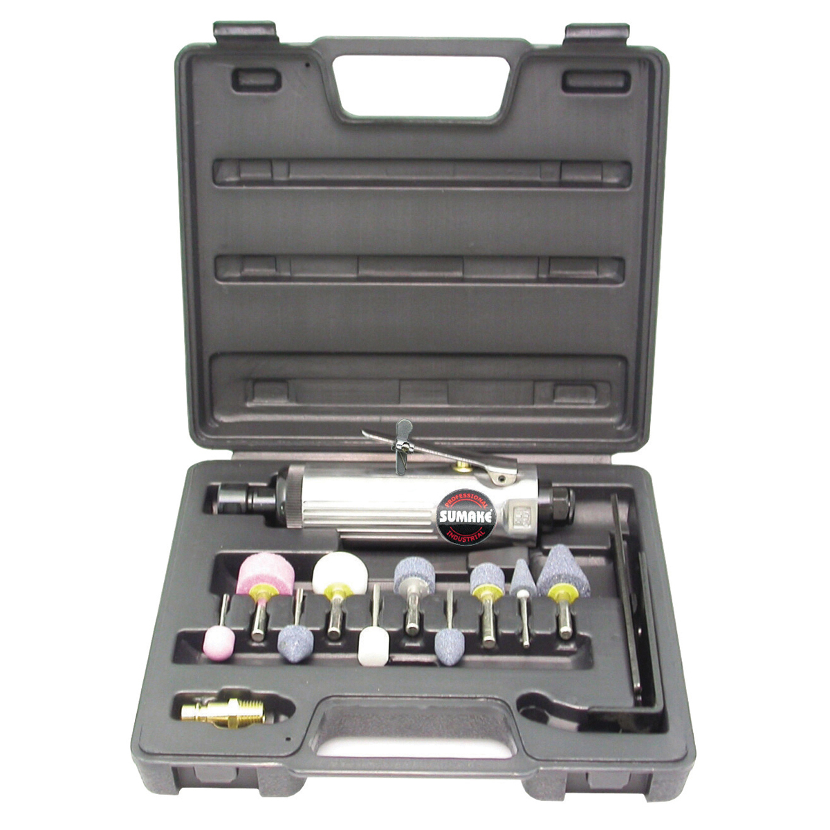 Ικανότητα: 6 mm Εισαγωγή: 1/4’’ Καταν/ση: 368 L/min Στροφές: 22.000 rpm ?Περιλαμβάνονται 10 Tεμ. πέτρες τριβής διαφόρων μεγεθών και αντάπτορας