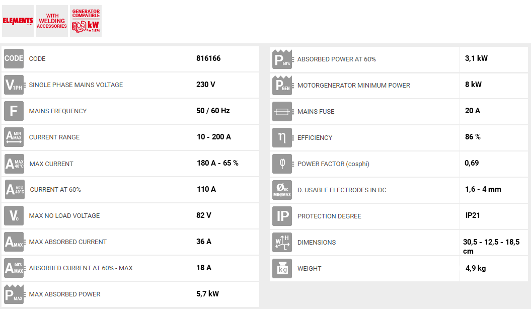 • Δυνατότητα χρήσης των παρακάτω τύπου ηλεκτρόδιων : ρουτιλίου , βασικό, ανοξείδωτο, χάλυβα, μαντέμι , κλπ.