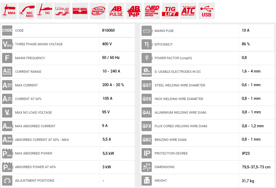 • AB PULSE – AB POP : Κορυφαίες τεχνολογίες  συγκόλλησης αποκλειστικά εξελιγμένες από την TELWIN για εφαρμογές σε υλικά όπως αλουμίνιο & braze. Η ιδέα δημιουργίας ειδικών κυματομορφών σχεδιασμένων για την συγκόλληση υλικών ιδιαίτερα ευαίσθητων στη θερμοκρασία, εγγυάται εκπληκτικά αποτελέσματα τόσο από δομικής και αισθητικής πλευράς συγκρίσιμα ακόμα και με συγκολλήσεις TIG.