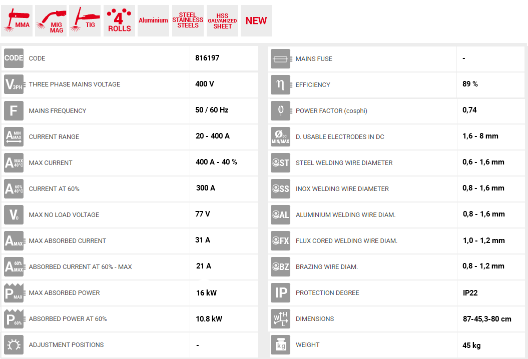 3 σε 1 MIG- MAG/FLUX/BRAZING/MMA και TIG DC-Lift τριφασικό αερόψυκτο inverter με 4 ράουλα Telwin Mastermig 405i. Λόγω του ευρέως φάσματος εφαρμογών της και της μεγάλης ευελιξίας ικανότητας κόλλησης διαφόρων υλικών της επιτρέπει να χρησιμοποιηθεί σε ένα μεγάλο εύρος εφαρμογών (μεταλλικές δομικές εργασίες, συντήρηση, εγκατάσταση κ.λπ.).