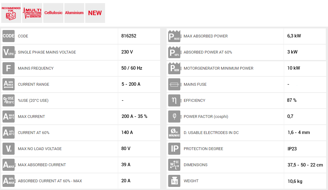 • Πλήρης με MMA εξαρτήματα συγκόλλησης και αλουμινίου θήκη μεταφοράς.