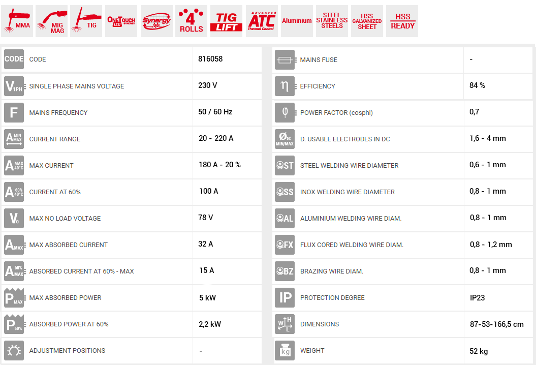 Ηλεκτροκόλληση inverter ελεγχόμενη από μικροεπεξεργαστή πολλαπλών λειτουργιών: MIG -MAG (συνεχής και παλμική ),FLUX /BRAZING /MMA/TIG DC – LIFT. Είναι ιδιαιτέρως κατάλληλη για συνεργεία και επιτρέπει την άμεση χρήση τριών διαφορετικών τσιμπίδων.