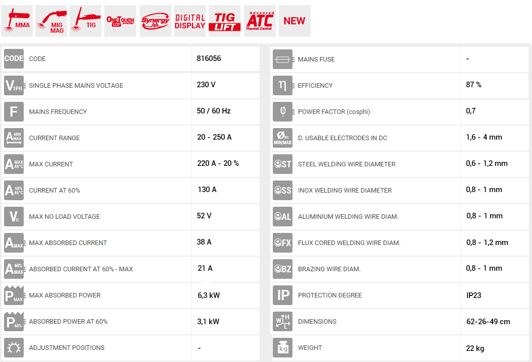 Ελεγχόμενο από μικροεπεξεργαστή και οθόνη LCD, Telwin Technomig 260 Dual Synergic φορητό αερόψυκτο inverter σύρματος MIG- MAG/FLUX/BRAZING και TIG DC-Lift. Λόγω του ευρέως φάσματος εφαρμογών της και της μεγάλης ευελιξίας ικανότητας κόλλησης διαφόρων υλικών (διαθέτει ξεχωριστά προγράμματα για σίδηρο, ανοξείδωτο, αλουμίνιο, braze και flux) της επιτρέπει να χρησιμοποιηθεί σε ένα μεγάλο εύρος εφαρμογών, από την συντήρηση στην εγκατάσταση και τις παρεμβάσεις στα συνεργεία.